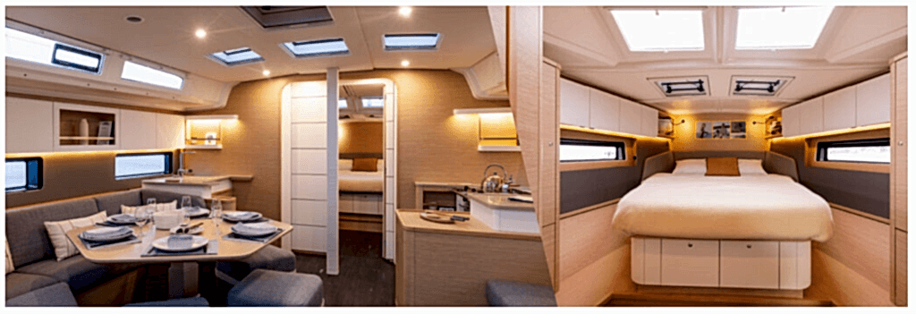 Aydınlık salon, tam donanımlı mutfak (ön veya uzunlamasına yerleşim seçenekleriyle) ve geniş kabinler, uzun seyirler ve uzun demirleme süreleri için ideal bir yaşam alanı sunuyor. Ön tarafta yer alan, ada yataklı ve özel banyolu master kabini, bu boyuttaki bir yelkenliden beklenen konforun da ötesine geçiyor.