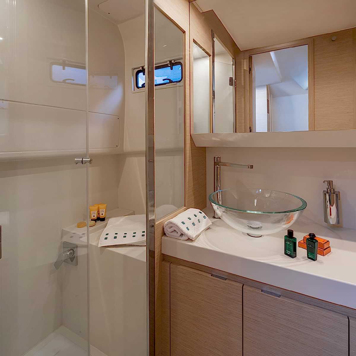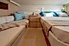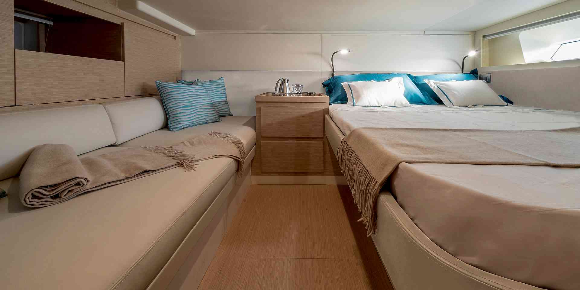 Geniş master kabin, sadece büyük yatlarda rastlanacak ölçüde bir yatağa ve ferah bir iç hacme sahiptir.