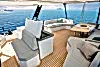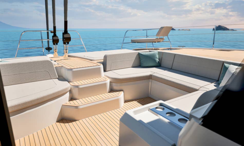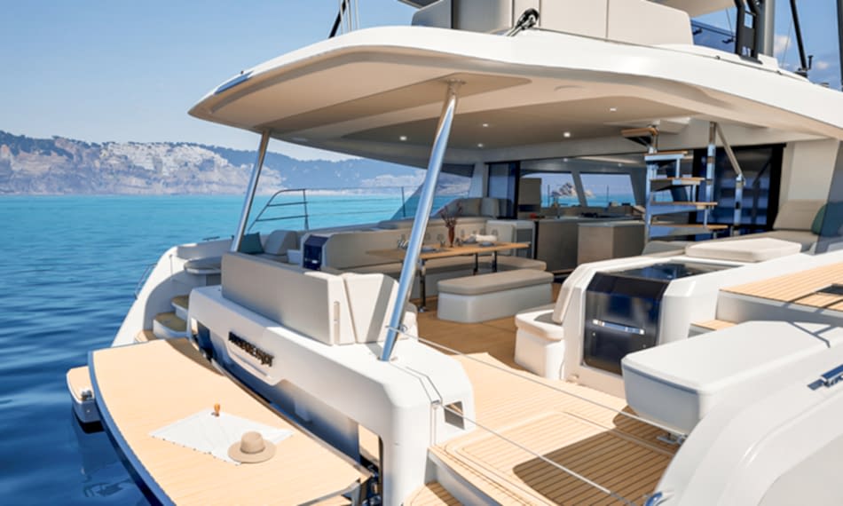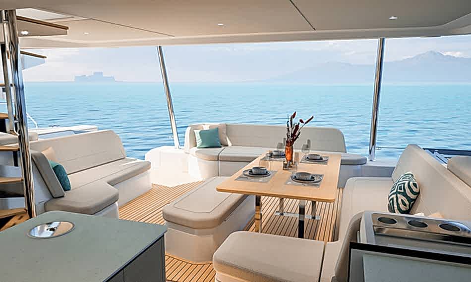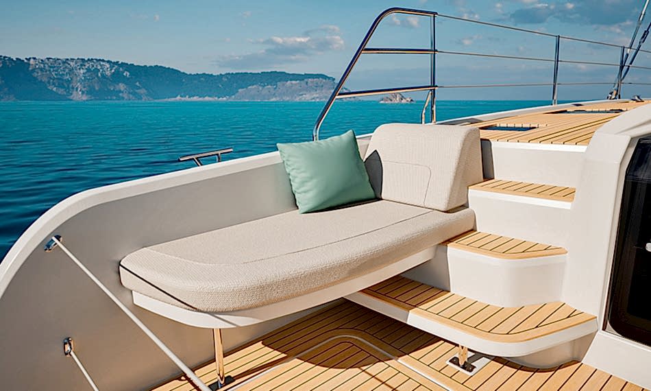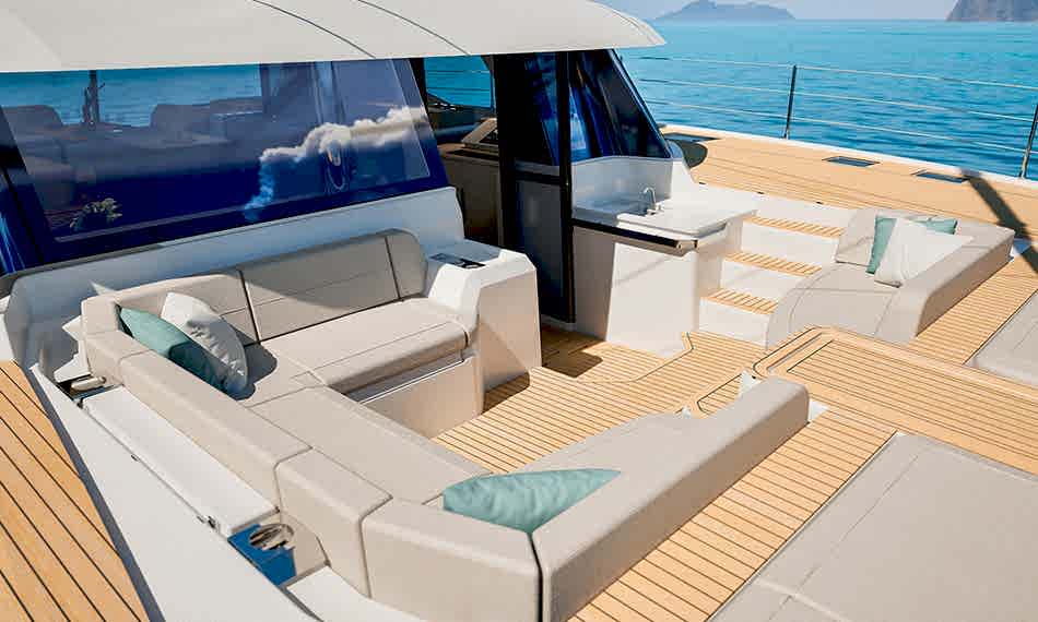 Ön ve arka kokpit arasında dengeli şekilde dağıtılmış yaşam alanları ile manevra ve dinlenme alanlarını birleştiren geniş flybridge, çevrenizi 360° panoramik bir manzarayla deneyimlemenizi sağlar.